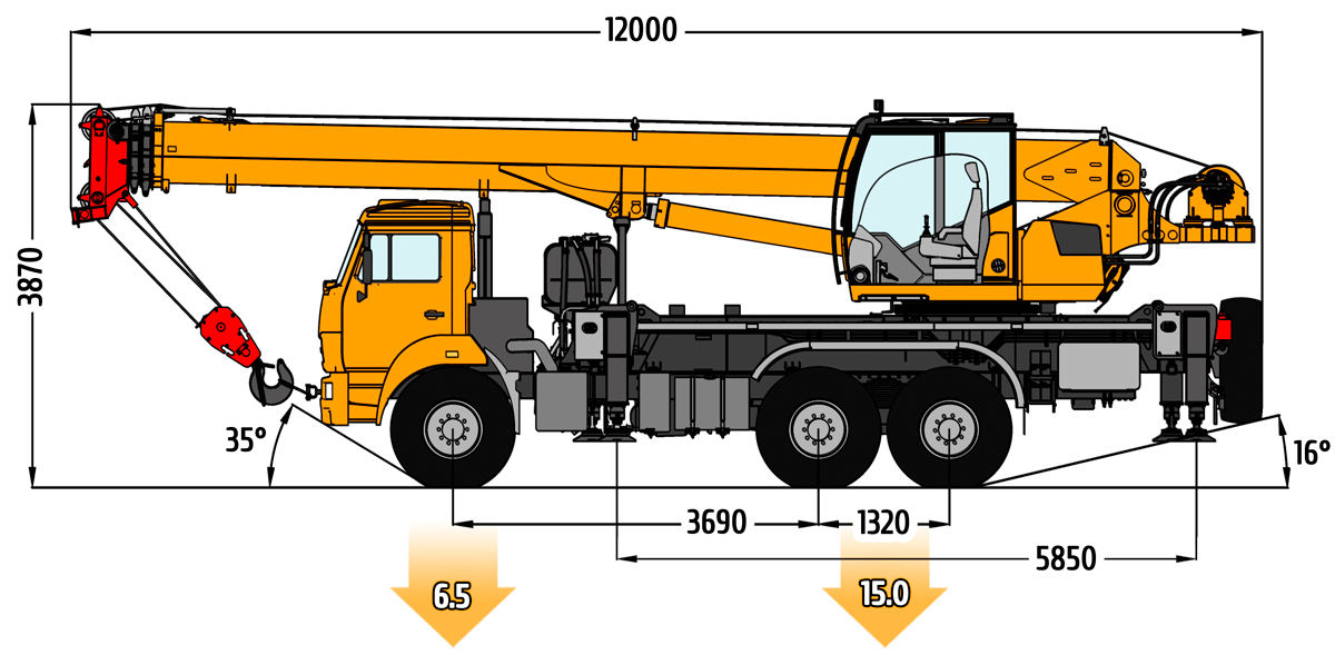 Грузоподъемность: 25 т Длина стрелы: 33,2 м Шасси: КАМАЗ-43118 (6х6)